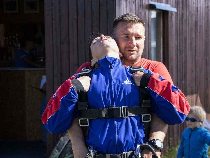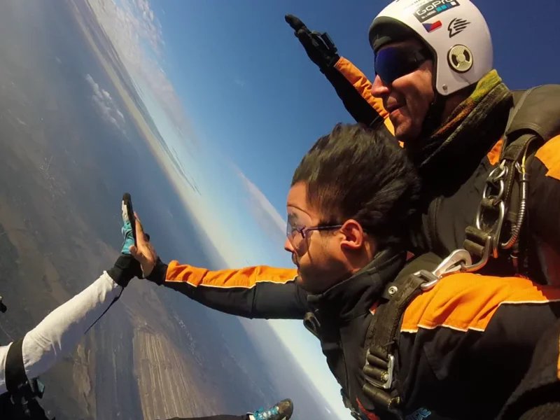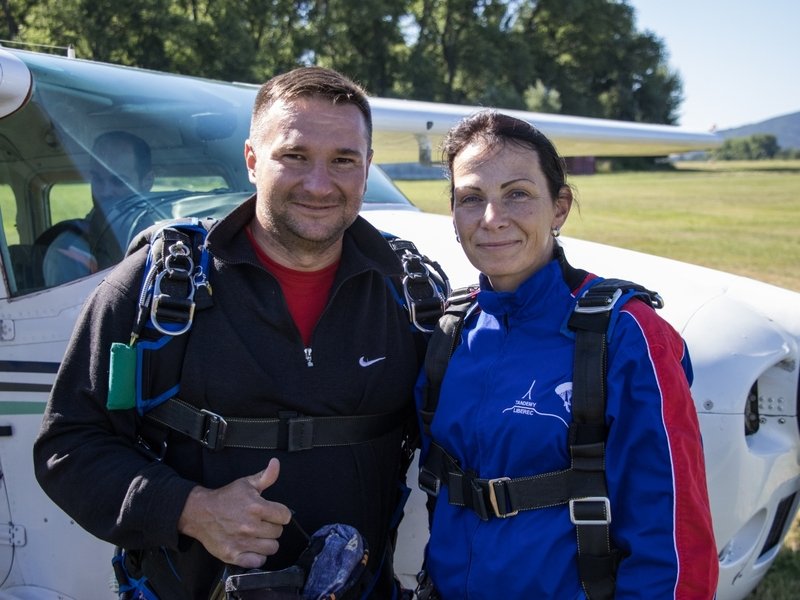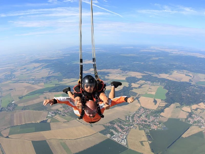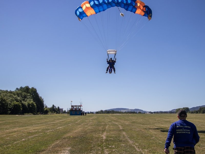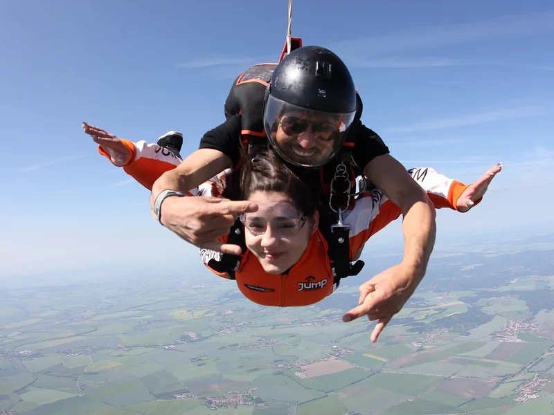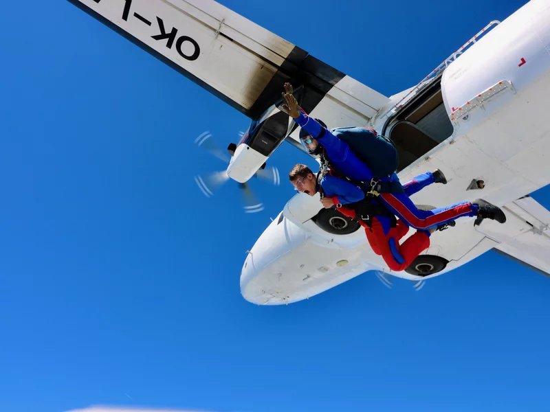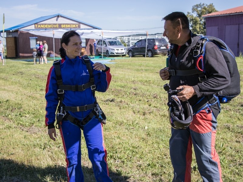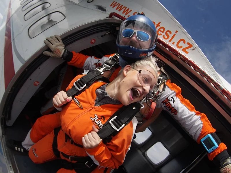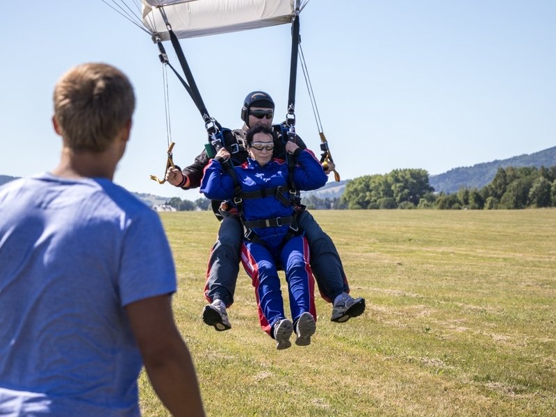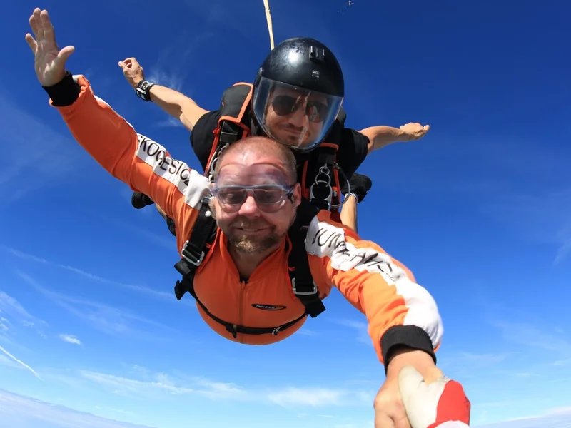 Tandemový seskok je jedinečná příležitost vyskočit si z letadla a zažít paráááádní euforii z volného pádu. Nejdříve proběhne krátká instruktáž, co při skoku dělat a co raději nedělat. Třeba se nedržet zuby nehty letadla. Pak přijde na řadu oblíkačka do výstroje a nástup do letadla. Veškeré obavy zmizí hned, když se dozvíte, že jeden instruktor zvládne klidně 387 seskoků za měsíc. A všechny bezpečně. Pak není žádný problém nastoupit do letadla a užít si vyhlídkový let vzhůru. Ve výšce 3 000 až 4 000 metrů se vyskočí a nastává očekávaný volný pád, který trvá zhruba jednu minutu v rychlosti až 200 km/h. Prostě paráda! Let s padákem zabere 10 až 15 minut a kochání krajinou je nezapomenutelné. Po dohodě s instruktorem lze vyzkoušet ovládání padáku a vzít let do vlastních rukou. Celý zážitek trvá přibližně 3 hodiny. Adrenalin koluje v žilách a po přistání je touha zkusit to znovu stále silnější. Kvůli velkému nárustu ceny paliv je možné, že bude na místě účtovaný palivový příplatek.