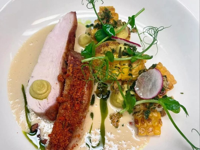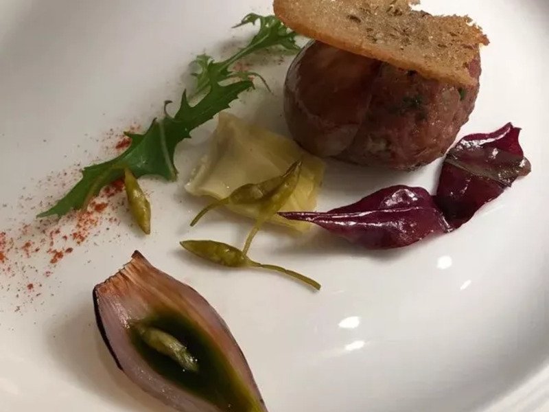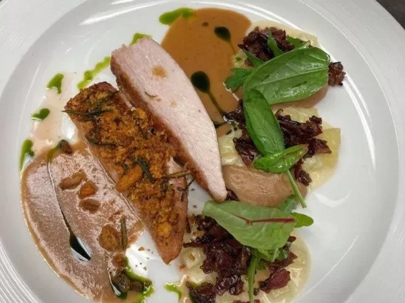 Teplý předkrm: bramborové ravioli, kachní maso, zelí, špek, škvarky, kmínový demi-glace