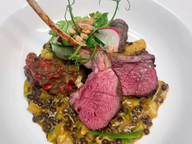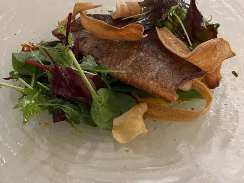Hlavní chod: jelení hřbet, ořechová krusta, bramborový fondant, černý kořen, květák, olej z medvědího česneku, vinná omáčka