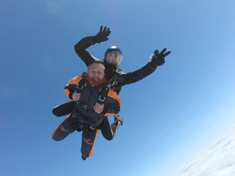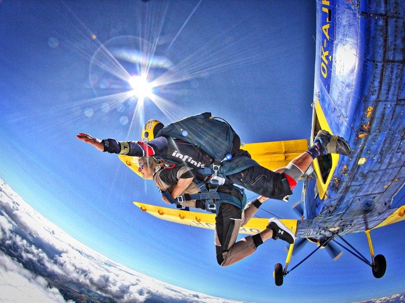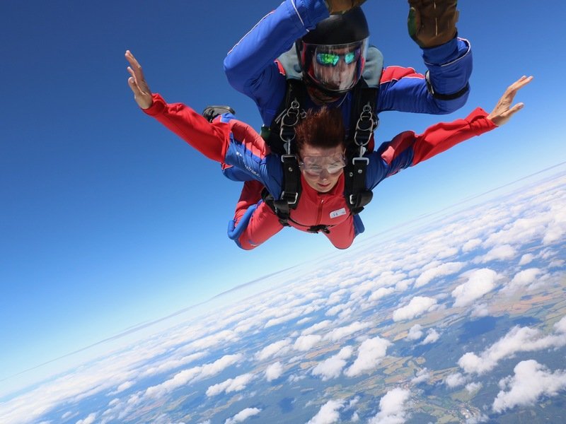 Ve výšce 3 000 metrů se dveře otevírají a skáčete! Začíná očekávaný volný pád trvající zhruba až 25 vteřin při rychlosti až 200 km/h. Prostě paráda!