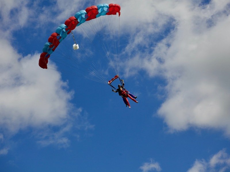 Zhruba v 1500 m instruktor otevře padák a svět se opět zpomalí. Nádherný let s padákem trvá 10 až 15 minut, během kterých si naplno užijete nezapomenutelné výhledy. Pokud si troufáte, po domluvě s instruktorem si můžete zkusit i řízení padáku.
