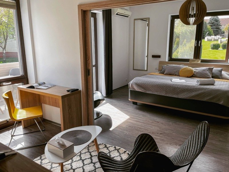 Naše pokoje De Lux Superior nabízejí maximální komfort díky pohodlnému dvoulůžku se zdravotní matrací a širokému výběru polštářů, abyste se vyspali jako v bavlnce. Každý pokoj je dále vybaven TV, minibarem s alko i nealko nápoji (včetně regionálních moštů a vín), fénem, rychlovarnou konvicí, klimatizací a individuálně nastavitelným vytápěním.