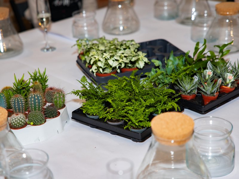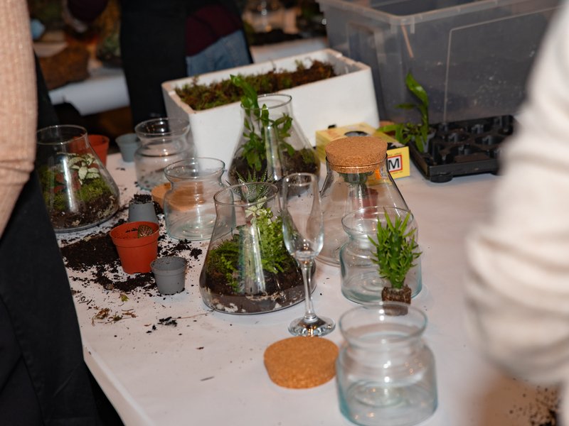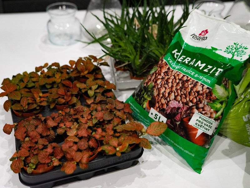 kompletní materiál k tvoření – čerstvý mech, různé druhy písku, kamínků, rostlin, dekoračních prvků a kvalitních skleněných nádob,