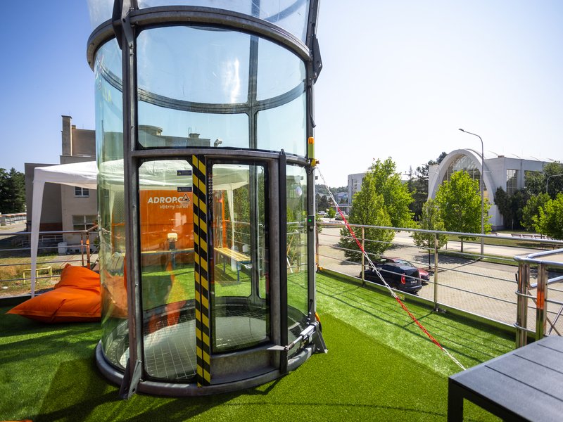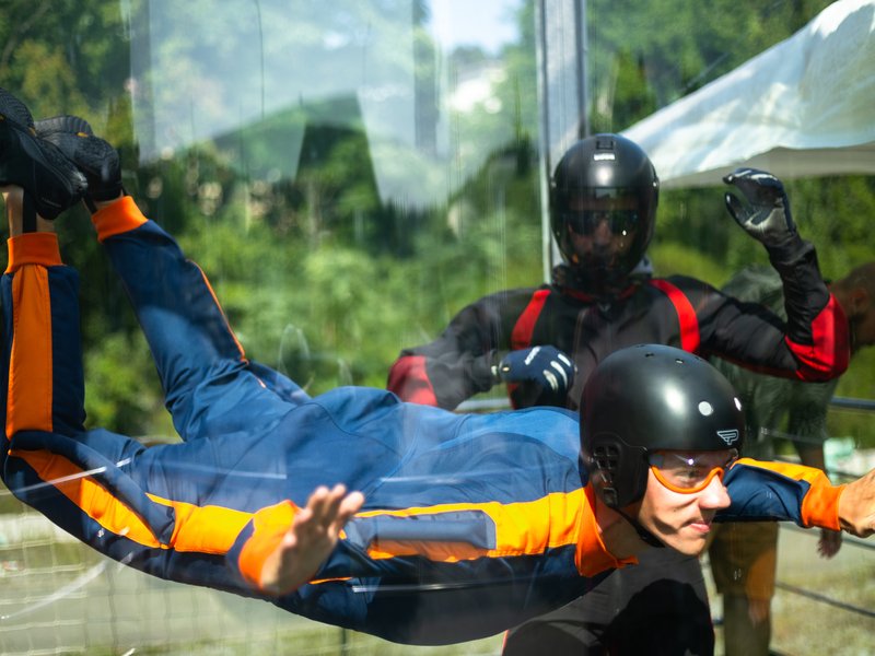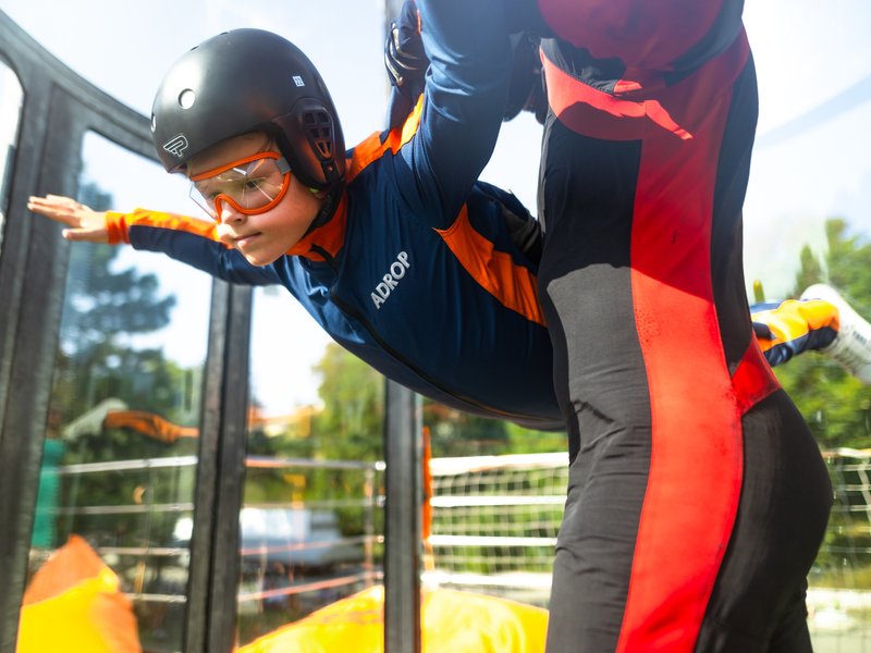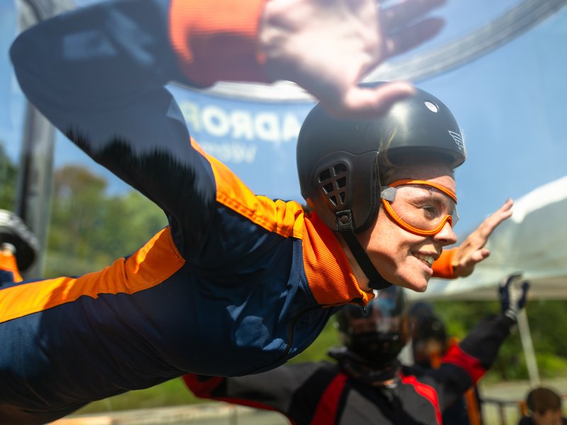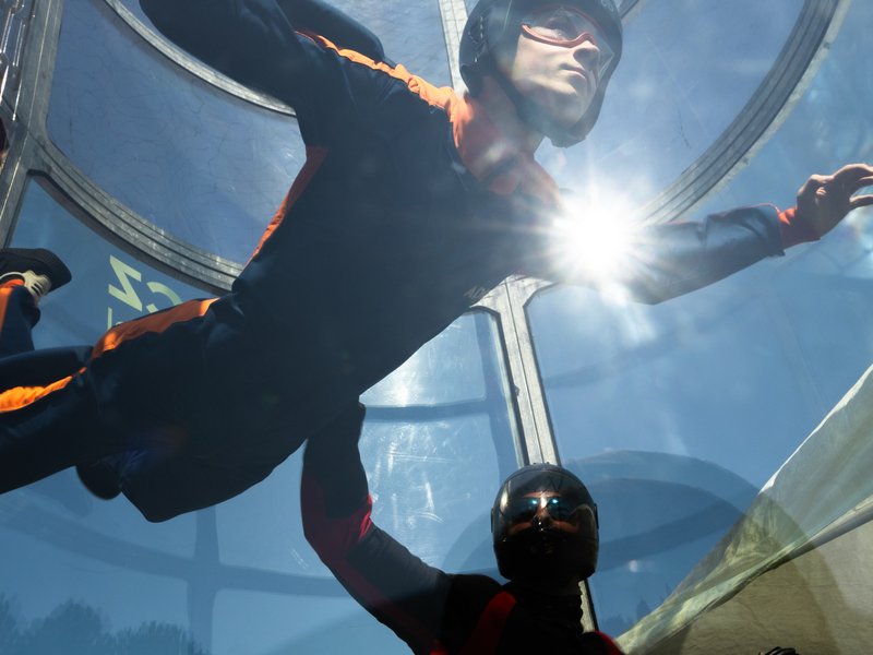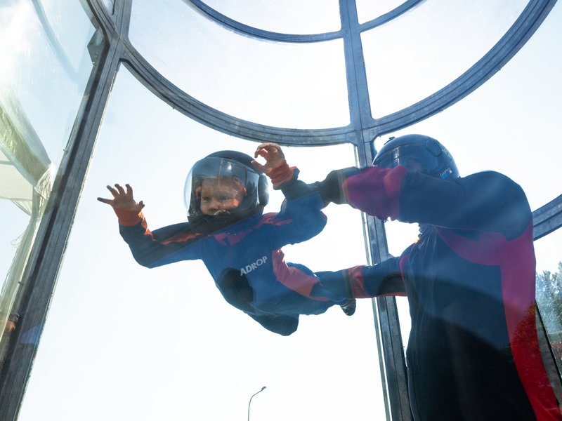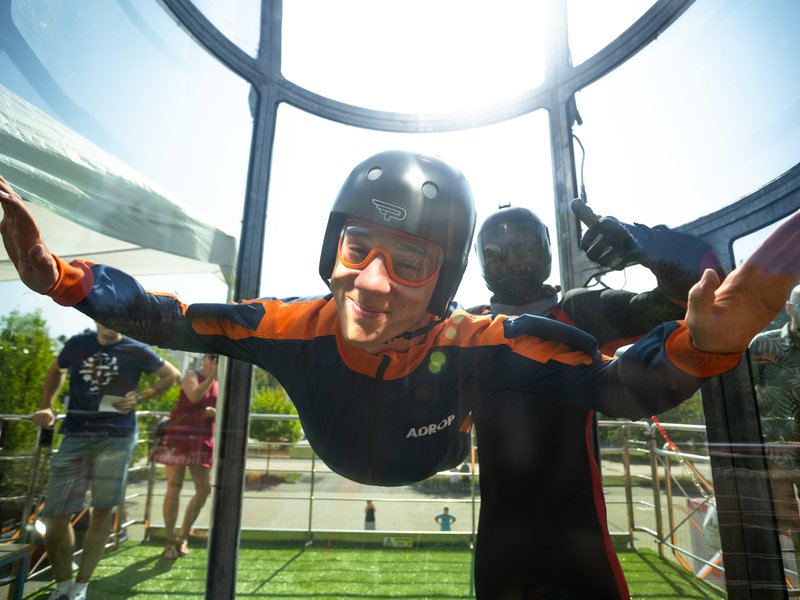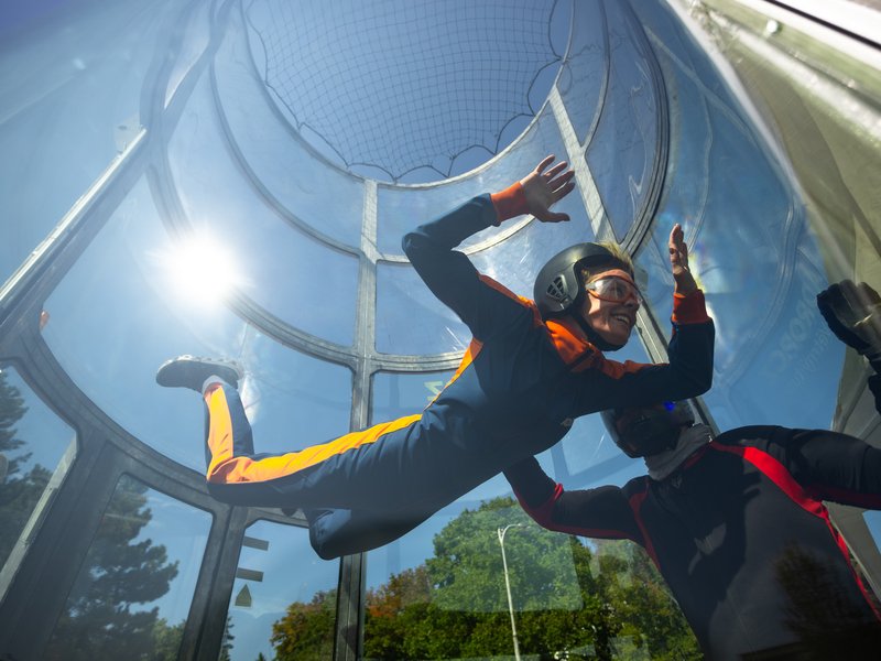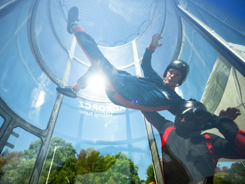 A hurá k letové komoře! Ta je uzavřena, takže nehrozí vypadnutí z proudu vzduchu. Letec je po celou dobu pod dohledem zkušeného instruktora. V krátkém čase se každý naučí ovládat své tělo ve větrném proudu.